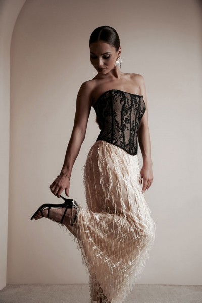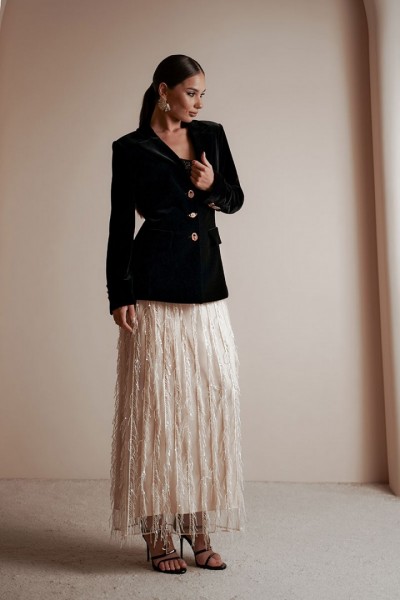 Юбка женская из костюмно-плательной ткани в пайетки, юбка прямого силуэта, длина макси, юбка на подкладке без боковых швов. Верх юбки с небольшой сборкой, пояс притачной, частично на резинке, застежка на потайную молнию и разрез по среднему шву сзади.