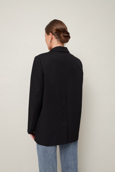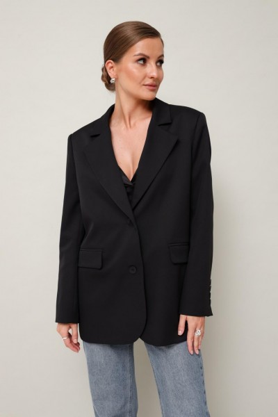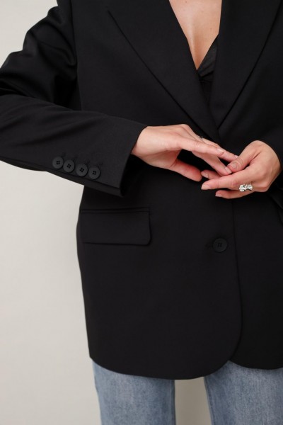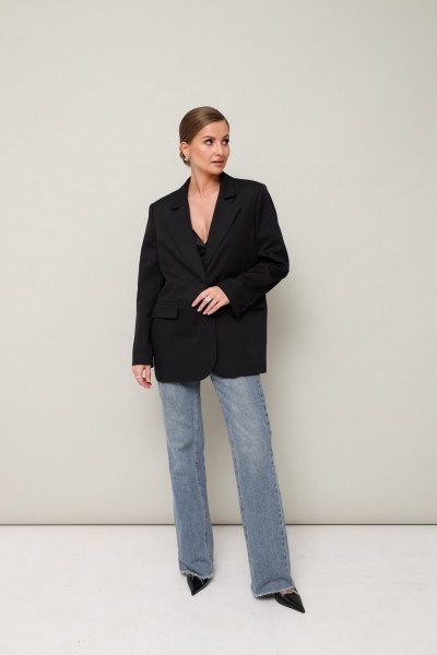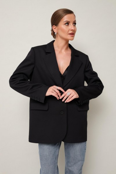 Жакет актуального прямого кроя, выполнен из костюмной ткани. Воротник пиджачного типа с отложными лацканами, край борта скругленный по низу жакета. Спереди обработаны прорезные карманы в рамку с клапанами. Рукава втачные двухшовные со шлицей и пуговицами. Спинка со средним швом, переходящим в высокую шлицу с застежкой на петли и пуговицы. Жакет на подкладке.
