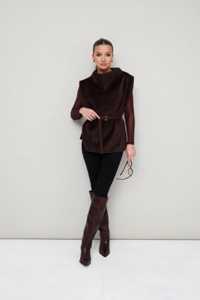 Стильный жилет прямого силуэта, выполнен из искусственного меха на подкладке. Цельнокроеный воротник-стойка. Идеальный выбор для холодных дней, который сочетает в себе комфорт, тепло и актуальный дизайн.