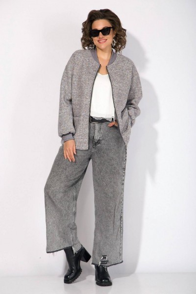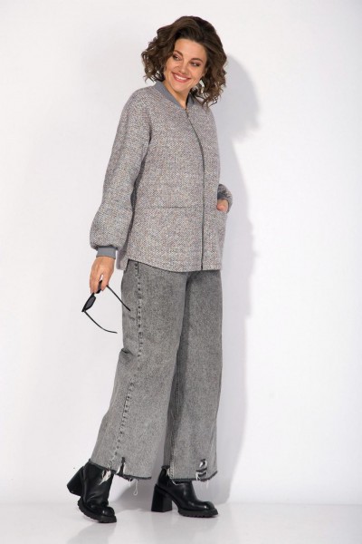 Женский твидовый жакет, по типу бомбера – стильная женская одежда на каждый день, которая станет отличным дополнением повседневного гардероба. Модель свободного силуэта, со спущенной линией плеча. Рукав длинный, с притачными манжетами по низу. Застежка центральная, на металлическую тесьму-молнию. Горловина обработана трикотажной планкой по типу – бомбера. Низ по полочке фигурный, по спинке удлинен. По полочке расположены рабочие карманы в шве! Свободная оверсайз модель подходит практически под любую фигуру. Модель на шёлковой подкладке! Длина пог спинке – 70 см, рукав – 62 см.