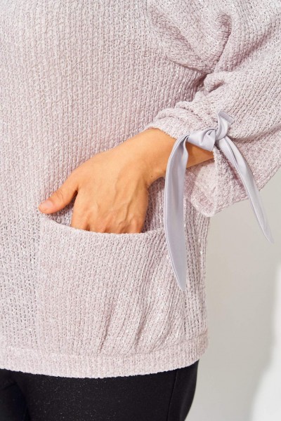 Эффектный, нарядный облегченный жакет, выполнен из вязанного трикотажа с эффектом легкого мерцания. Модель свободного силуэта, с рукавом длиной ¾-ти на спущенном плечевом поясе. Горловина обработана полулежащей стойкой. Застежка центральная на молнию. По полочке расположены аккуратные накладные карманы. Низ изделия оформлен притачной планкой. Изюминкой данной моделям служит необычные паты по рукаву с завязкой в виде банта.