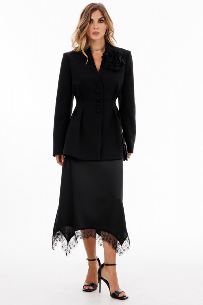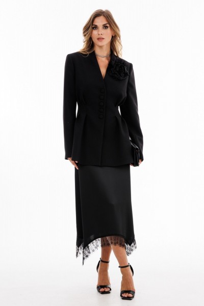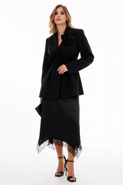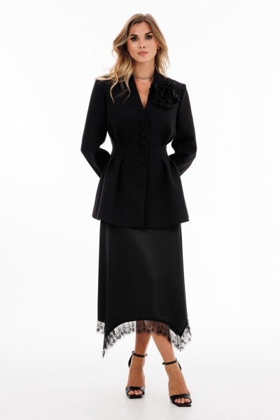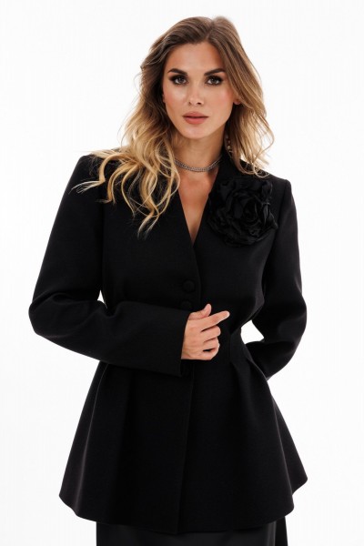 Жакет выполнен из костюмной ткани. Жакет Х-образного силуэта, длиной ниже линии бедер. Спереди центральная бортовая открытая застежка на пуговицы и вытачка для прилегания воротника. На спинке средний шов, две складки и вытачка для прилегания воротника. Вортник - цельнокроеная стойка. Плечевой шов удлинен. Рукав втачной двухшовный. Жакет на притачной по низу подкладке.