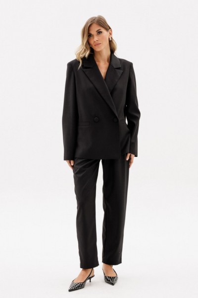 Жакет выполнен из костюмной ткани. Жакет прямого силуэта длиной до линии бедер. Спереди лацканы. Застежка двубортная на обтяжные пуговицы. Воротник пиджачного типа. Спинка со средним швом. Рукав втачного, двухшовный. Жакет на притачной по низу подкладке. В комплект входит съемный пояс из основной ткани.