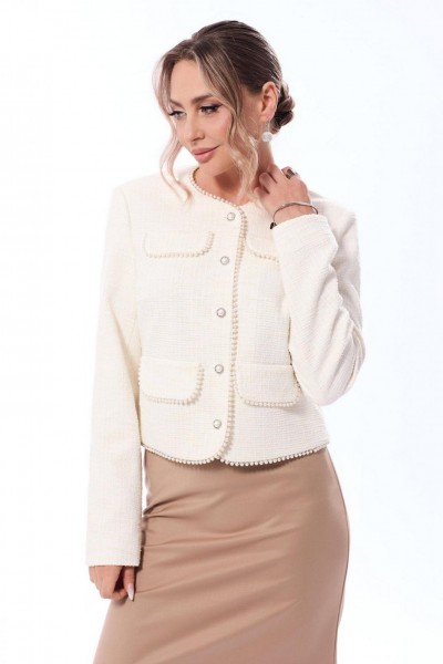 Жакет прямого силуэта с центральной застежкой на петли и пуговицы, без воротника, с круглым вырезом горловины. По переду с нагрудными вытачками. На уровне груди и линии талии расположены настрочные клапаны . Спинка со средним швом. Рукав втачной, длинный. Вдоль линии борта, горловины и клапанов- декоративная тесьма с бусинами.