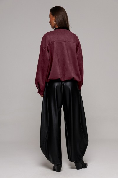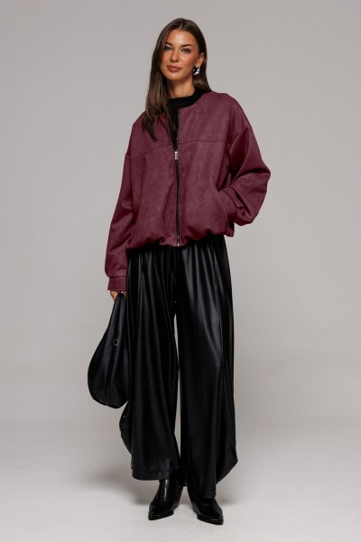 Жакет-бомбер из искусственной замши свободного силуэта со спущенной линией плеча. Рукав втачной двухшовнный, внизу со складками, притачной манжетой с застежкой на кнопку. Полочка с застежкой на тесьму молнию, с кокеткой и карманами с застежкой на молнию. Синка с кокеткой. По горловине планка из довяза. Низ жакета-бомбера со сборкой. Изделие на подкладке.