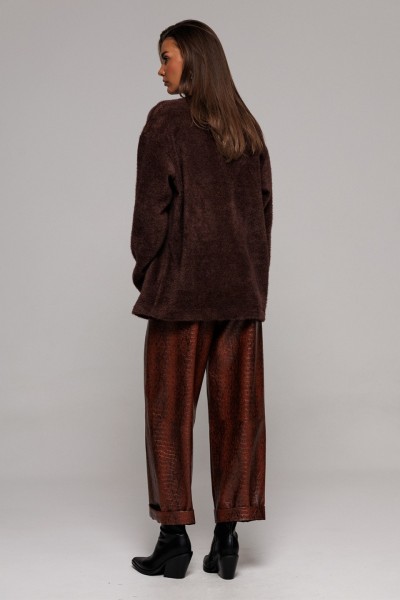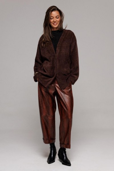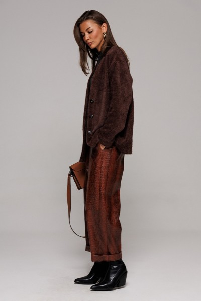 Элегантный кардиган коричневого цвета выполнен из мягкого трикотажного полотна, создавая уютное настроение. Дизайн свободного силуэта, слегка сужается к низу, обеспечивая комфортное облегание. Спущенная линия плеч и втачные рукава добавляют современный акцент в стиль одежды. Воротник с V-образным вырезом и центральная застежка на пришивные кнопки придают изящество модели, подчеркивая безупречный вкус. Идеален для создания стильного повседневного образа.
