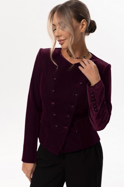 Жакет с центральной двубортной застежкой на петли и пуговицы, без воротника.По переду с двумя рельефными швами, выходящими из проймы. На уровне линии талии расположены клапаны. Спинка со средним швом, рельефными швами, выходящими из проймы. Длина изделия: 52 см. Длина рукава: 62 см