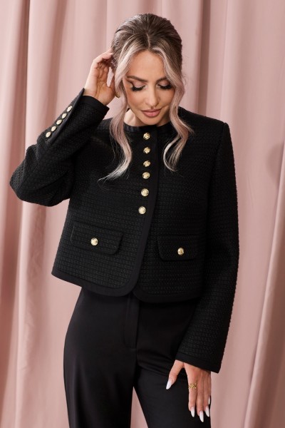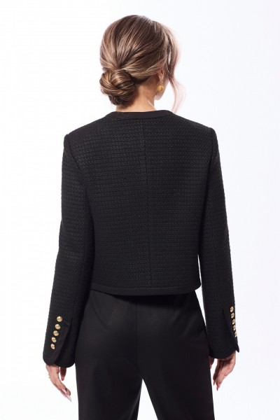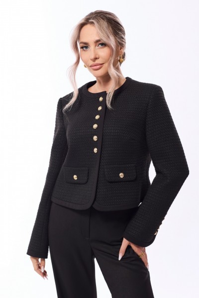 Жакет с центральной застежкой на петли и пуговицы, без воротника, с круглым вырезом горловины. По переду с нагрудными вытачками. На уровне линии талии- настрочные клапаны, зафиксированные к жакету петлей и пуговицей. Низ жакета фигурный. По горловине, краю борта и низу- настрочная планка. Спинка со средним швом. Рукав втачной, длинный со шлицей по локтевому шву и застежкой на петли и пуговицы. По низу рукава и шлице- отрезная планка.