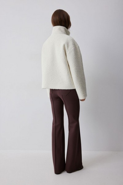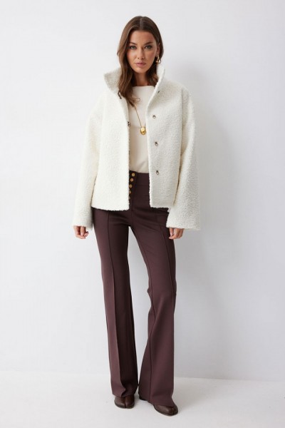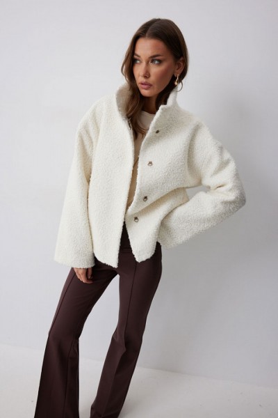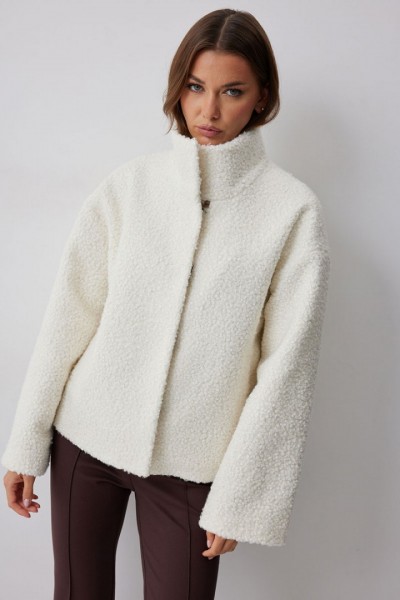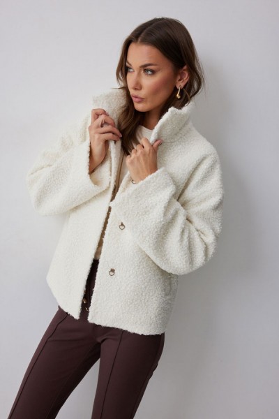 Жакет прямого силуэта из букле на трикотажной основе. Воротник-стойка. Центральная застежка на крючки. Рукав со спущенной линией плеча. По переду прорезные карманы. Жакет на подкладке. Обращаем ваше внимание, что фурнитура может отличаться от фото.