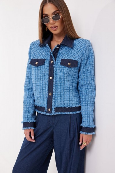 Жакет женский в стиле «шанель» прямого силуэта, длиной выше линии бедер, на подкладке, застежка центральная на планку с петлями и пуговицами. По спинке и переду кокетки, выкроенные по косой, в швах кокеток клапаны из отделочной ткани. Воротник стояче-отложной. Рукав втачной двухшовный с притачными манжетами из отделочной ткани. Воротник, планки, клапаны, манжеты и планка по низу жакета - из отделочной ткани. По швам притачивания планок и манжет декоративная бахрома из основной ткани.