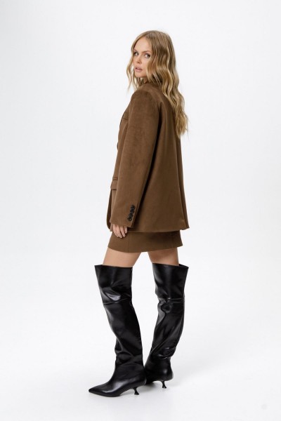 Детали: жакет прямого силуэта, расширенная линия плеч, пиджачный воротник, перед с функциональными карманами, однобортная застежка на петли и пуговицы, спинка со средним швом и шлицей, рукава втачные двухшовные, жакет на подкладке