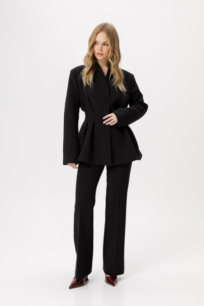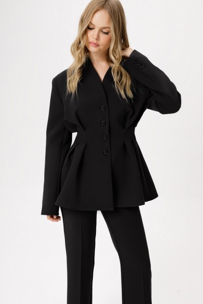 Детали: полуприлегающий силуэт с расширенными плечами, цельнокроеный воротник-стойка, застежка на петли и пуговицы, рукава втачные двушхшовные, жакет на подкладке