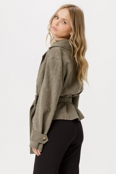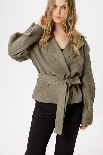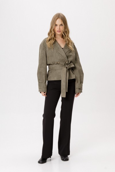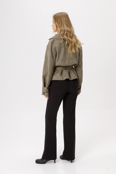 Детали: прямой силуэт, спущенные плечи, пиджачный воротник, рельефные швы по переду и спинке, кокетка спинки, рукава втачные, смещённая застёжка на петлю и пуговицу, съемный пояс, жакет на подкладке.