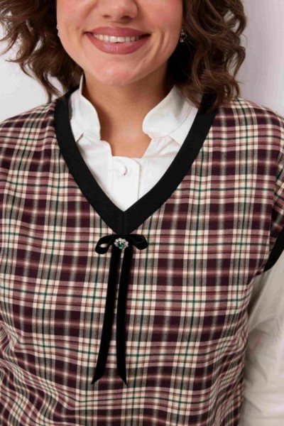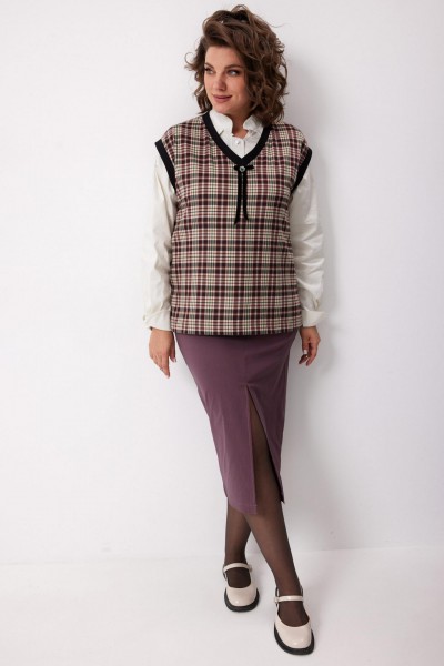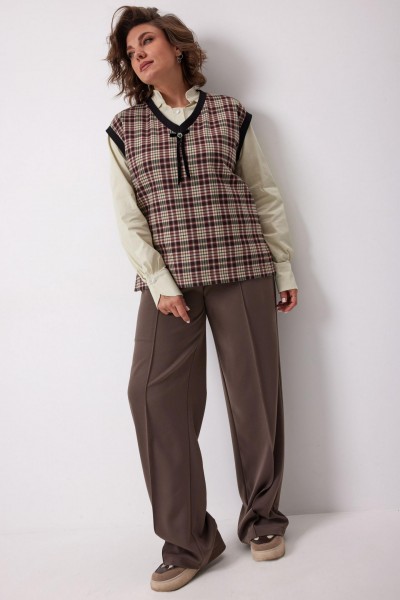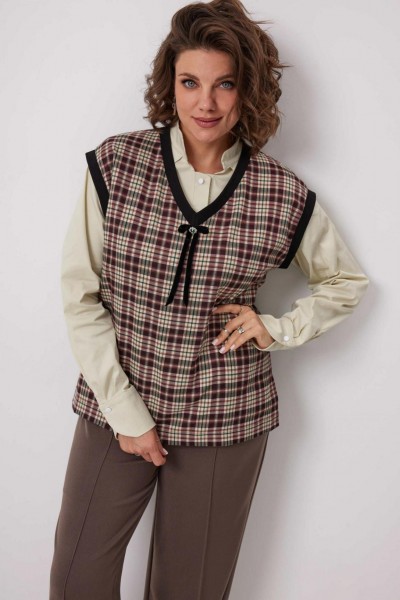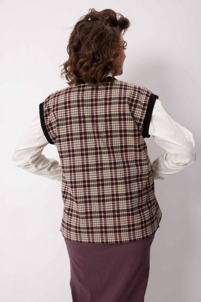 Жилет - это стильный элемент женской одежды, который позволяет создавать многослойные образы в любое время года. Предлагаем Вам стильный женский жилет, который станет незаменимой вещью в Вашем гардеробе. Мягкая костюмная ткань дарит ощущение комфорта на протяжении всего дня, а актуальный принт в клетку добавляет модели элегантность и изысканность. V-образный вырез красиво подчёркивает линию шеи и декольте. Жилет прекрасно сочетается как с блузами и рубашками для деловых встреч, так и с лонгсливами для более расслабленных образов. Жилет прямого кроя с V-образным вырезом и слегка спущенной линией плеча. Горловина и проймы обработаны обтачкой контрастного цвета. В боковых швах разрезы. Жилет декорирован пуговицей и бантом из бархатной тесьмы. На фото представлены блуза арт. 4135, брюки арт. 6070.