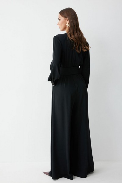 Комбинезон полуприлегающего силуэта с расширенными книзу брюками из струящейся ткани. Комбинезон отрезной по линии талии на резинке, верхняя часть комбинезона на запах. Рукав втачной, длинный, по низу манжета с застежкой на петлю и пуговицу. На спинке в среднем шве застежка на потайную молнию. В боковых швах карманы. В комплект входит пояс. Обращаем ваше внимание, что фурнитура может отличаться от фото.