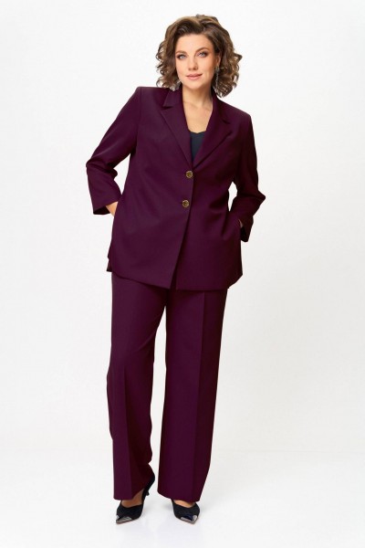 Костюм женский двухпредметный, состоящий из жакета и брюк. Жакет полуприлегающего силуэта, удлиненный, с центральной бортовой застежкой на 2 петли-пуговицы до линии перегиба лацкана. Перед с нагрудными вытачками, выходящими из горловины. Боковые швы с разрезами, между которыми по спинке вставлен пояс фигурной формы с декоратичной нашивкой. Спинка со средним швом. Воротник пиджачного типа. Рукава втачные двухшовные длиной 3/4. Брюки палаццо с притачным широким поясом на резинке от заутюженных стрелок по передней половинке вкруговую. Застежка на тесьму-молнию в средних срезах передних половинок брюк и 2 петли-пуговицы по поясу.