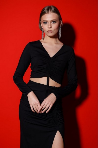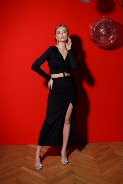 Комплект состоит из топа и юбки, выполнен из качественного бифлекса, эластичного, приятного к телу. Юбка с глубоким вырезом спереди, с кулисой, регулирующая уровнь натяжения и длина изделия. Топ также с кулисой, длину которого можно регулировать и может получиться полноценный джемпер, прикрывающий живот.