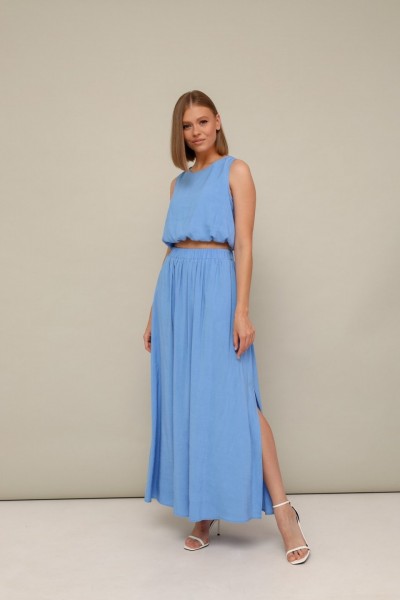 Элегантный комплект, состоящий из блузки и юбки. Округлый вырез горловины. Низ блузки собран на резинку. По спинке разрез с застежкой на пуговицу и навесную петлю. Юбка Аобразного силуэта, с притачным поясом на