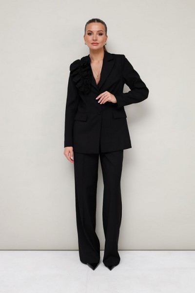Эффектный 2-предметный комплект, состоящий из жакета и брюк, выполненный из костюмной ткани. Жакет женский полуприлегающего силуэта с центральной застежкой на петли и обтяжные пуговицы. Воротник пиджачного типа с отложными лацканами. Спереди обработаны прорезные карманы в рамку с клапанами. Рукава втачные двухшовные. Спинка со средним швом и рельефами. Изделие обработано подкладкой. Брюки прямого силуэта с заутюженными стрелками и с боковыми наклонными карманами. Пояс притачной с застежкой на пуговицу и тесьму-молнию, по спинке пояс на резинке для регуляции размера. В комплекте прилагается съемная брошь из основной ткани.