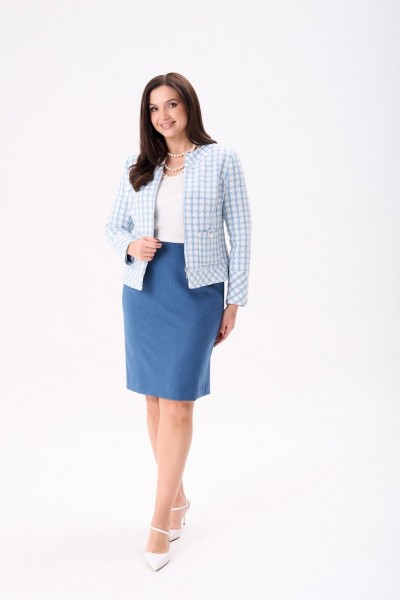 Костюм женский полуприлегающего силуэта состоит из жакета и юбки. Жакет на подкладке. По переду нагрудные вытачки, накладные фигурные карманы, застёжка на тесьму молния. Спинка с талевыми вытачками и центральным швом. По горловине и низу жакета притачная планка. Горловина круглая. Рукава двухшовные втачные на широкой манжете. Юбка, слегка зауженная к низу, без пояса, на обтачке. По переду талевые вытачки. По спинке талевые вытачки. Застёжка потайная тесьма молния расположена в центральном шве спинки. Юбка на подкладке.