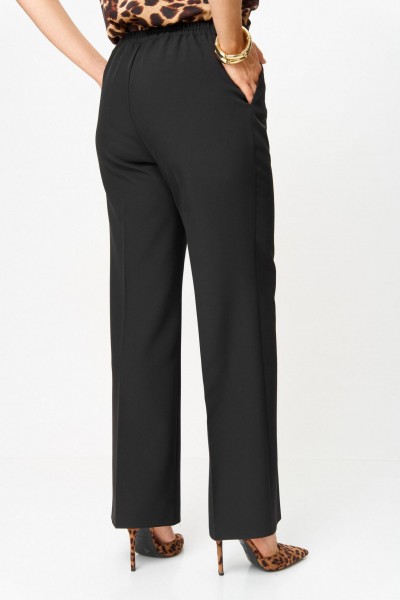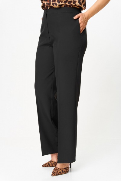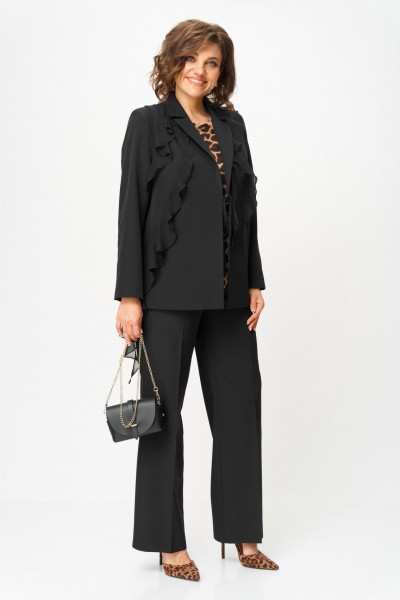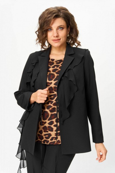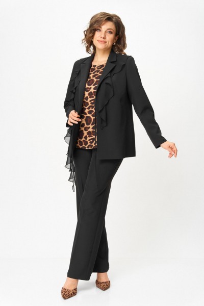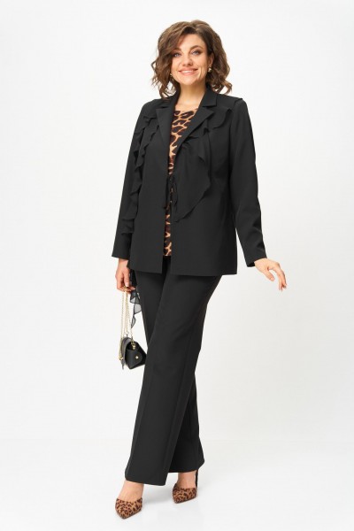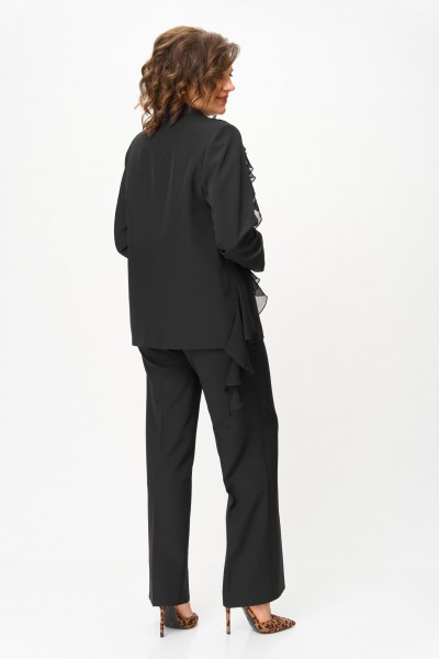 Костюм женский трехпредметный, состоящий из жакета, блузки и брюк. Жакет полуприлегающего силуэта, скомбинированный из двух видов ткани с центральной бортовой застежкой встык на завязки с фигурным подрезом из горловины и до бокового шва. Жакет с ассиметричными вставками из шифона в виде воланов. По правой части переда шифон с 3 складками вставлен по плечевому шву, частично по горловине и ниспадает из пройм. Второй волан вставлен в рельефный подрез, имеет разную ширину и не доходя до бокового шва ниспадает сходя на нет шлейфом. По левой части переда шифоновый волан фигурной формы вставлен в плечевой шов, горловину, и ниспадает на нет. Спинка со средним швом. Рукав втачной длинный двухшовный. Брюки классического кроя, прямые, с заутюженными кантами, с притачным поясом сзади на резинке и боковыми карманами с отрезным бочком. Застежка на тесьму-молнию в средних срезах передних половинок брюк.
