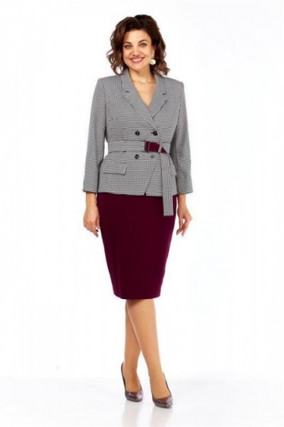 Костюм женский, состоящий из жакета и юбки. Жакет полуприлегающего силуэта, с двубортной застежкой на петли и пуговицы. Воротник пиджачного типа. По переду - рельефный шов, нагрудная вытачка и клапан. Спинка со средним швом и талиевыми вытачками .Рукав двухшовный, по низу которого - разрез. Жакет на частичной подкладке (по переду). В качестве дополнения предполагается пояс. Юбка-карандаш прилегающего силуэта. По переду и спинке-талиевые вытачки. В среднем шве спинки - застежка на потайную тесьму-молнию и шлица. Юбка на подкладке.