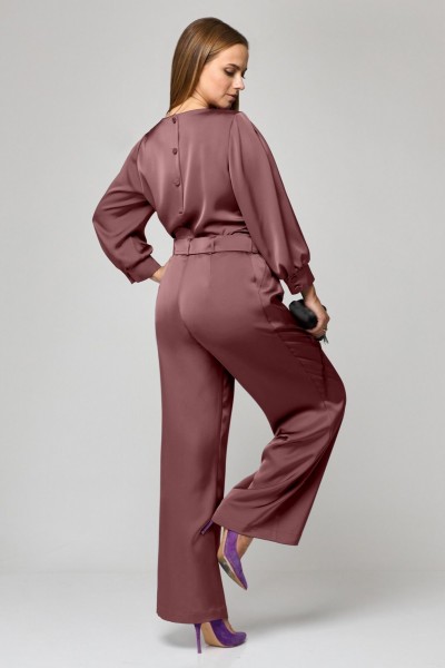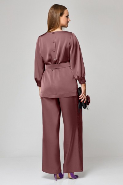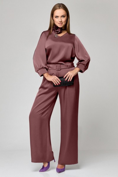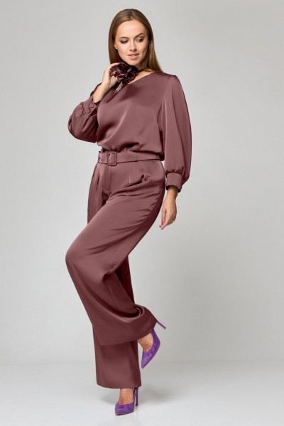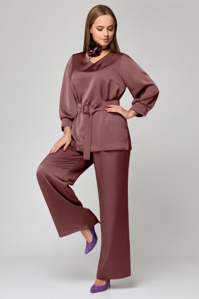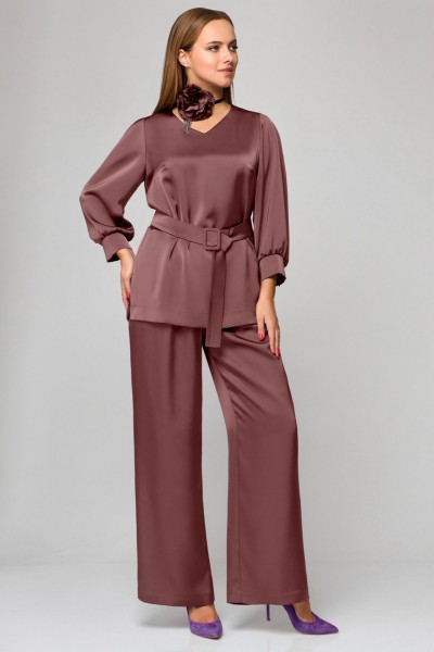 Комплект женский двухпредметный. Блузка - прямого силуэта с V-образным вырезом горловины. По спинке застежка на 3-петли и пуговицы. В боковых швах разрезы. Рукав втачной со складкой по низу с манжетой. Брюки классического покроя, прямые от бедра. В боковых швах карманы с отрезными бочками. Пояс отрезной со шлевками. Застежка на молнию и петлю с пуговицей. Изделие дополнено съемным поясом из основной ткани на пряжке. Длина блузки 69 см, длина рукава 52 см, длина брюк 106 см. Украшение в комплект не входит.