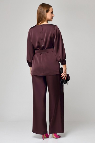 Комплект женский двухпредметный. Блузка - прямого силуэта с V-образным вырезом горловины. По спинке застежка на 3-петли и пуговицы. В боковых швах разрезы. Рукав втачной со складкой по низу с манжетой. Брюки классического покроя, прямые от бедра. В боковых швах карманы с отрезными бочками. Пояс отрезной со шлевками. Застежка на молнию и петлю с пуговицей. Изделие дополнено съемным поясом из основной ткани на пряжке. Длина блузки 69 см, длина рукава 52 см, длина брюк 106 см. Украшение в комплект не входит.