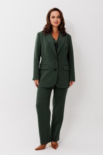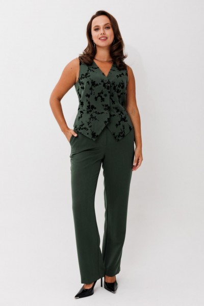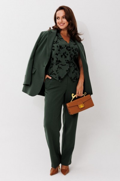 Элегантный женский костюм, состоящий из жакета, жилета и прямых брюк, выполнен из костюмной ткани с флоковым напылением — материал стабилизирован, не растягивается и отлично держит форму. Жакет однобортный, на петлях и пуговицах, с английским воротником и клапанами по бокам. Рукав втачной, длина — полная. Посадка свободная, что обеспечивает комфорт и стильный силуэт. Жилет женский из костюмной ткани с флоковым напылением по полочкам и однотонной спинкой без флока. Модель выполнена на подкладке, что обеспечивает идеальную посадку и комфорт при носке. Фасон приталенный, с V-образным вырезом и застёжкой на петли и пуговицы. По линии талии — декоративный хлястик по спинке, подчёркивающий фигуру. Полочки оформлены листочками имитации карманов, низ жилета — с фигурным вырезом по центру, визуально вытягивающим силуэт. Брюки прямого кроя, на частичной резинке по поясу для удобной посадки и идеального прилегания.