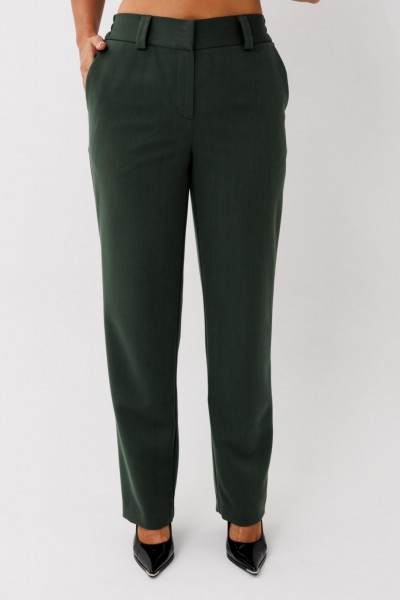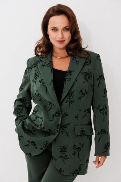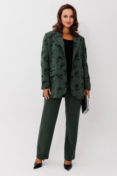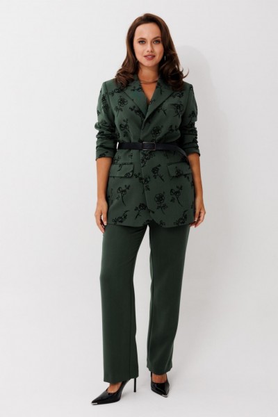 Элегантный женский костюм, состоящий из жакета и прямых брюк, выполнен из костюмной ткани с флоковым напылением — материал стабилизирован, не растягивается и отлично держит форму. Жакет однобортный, на петлях и пуговицах, с английским воротником и клапанами по бокам. Рукав втачной, длина — полная. Посадка свободная, что обеспечивает комфорт и стильный силуэт. Брюки прямого кроя, на частичной резинке по поясу для удобной посадки и идеального прилегания.