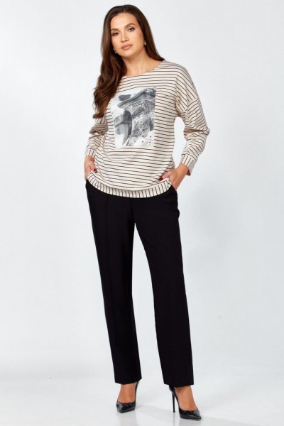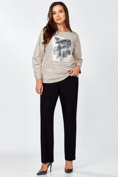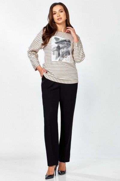 Комплект женский , двух предметный состоящий из туники и брюки. Туника прямого силуэта выполнена из трикотажного полотна « в полоску» . Горловина переда обработана обтачкой. Линия плеча спущена . По переду авторская термопечать. Рукав втачной, двухошовный, по переднему шву рукава сборка. По низу изделия и рукава приточная манжета. Длина изделия по спинке- 63 см, длина рукава от горловины – 64 см. Брюки прямого силуэта на притачном поясе, с застежкой на тесьму- молнию и 1 пуговицу и петлю, с боковыми наклонными карманами на передних половинках брюк . По передним и задним половинкам брюк заутюжен кант. Для лучшего прилегания брюк в области талии в поясе по бокам вставлена резинка. Длина брюк по боковому шву без пояса- 102 см.