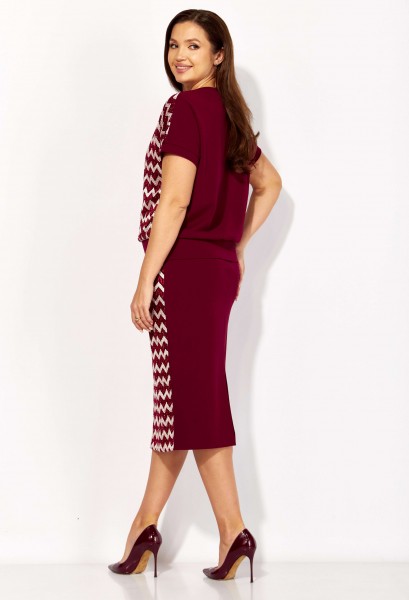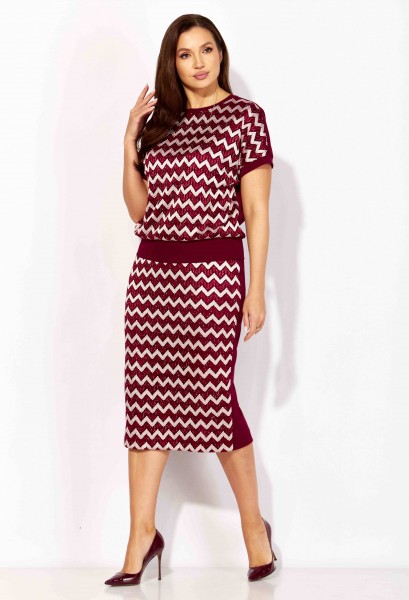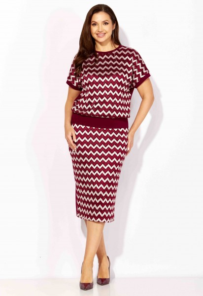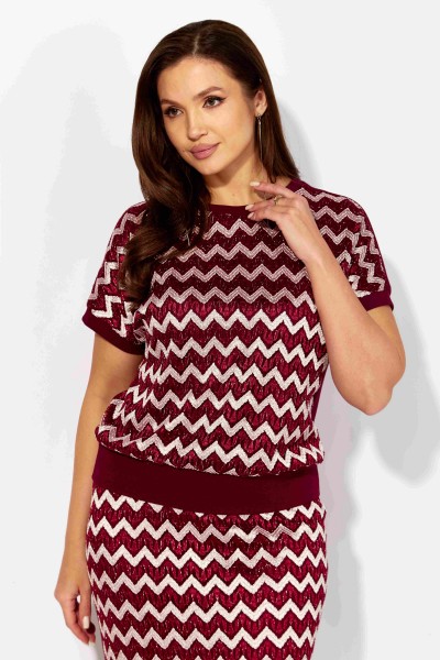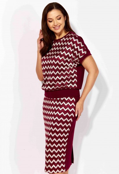 Комплект женский, 2х предметный, состоящий из блузы и юбки. Блуза прямого силуэта, с коротким цельнокроеным рукавом, снизу на манжете. Вырез горловины круглой формы. По низу рукавов и горловине подрезные бейки. Юбка прямая. Сзади средний шов и подрез снизу. Пояс на резинке(по переду отрезной, по спинке цельнокроеный) Перед блузы и юбки выполнен из полотна с паетками, спинка блузы и юбки из гладкого трикотажного полотна. По переду блузы и юбки трикотажная подкладка.