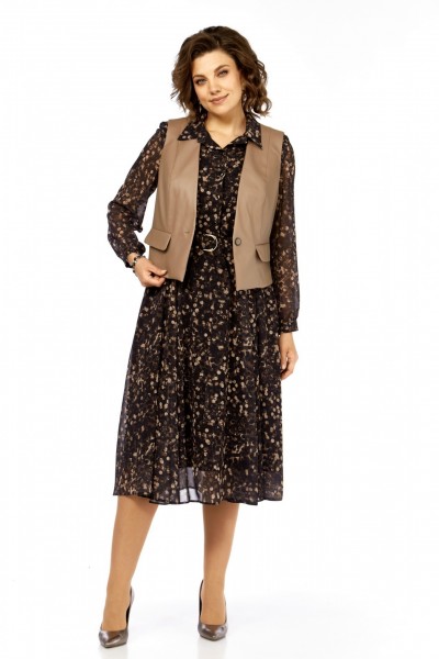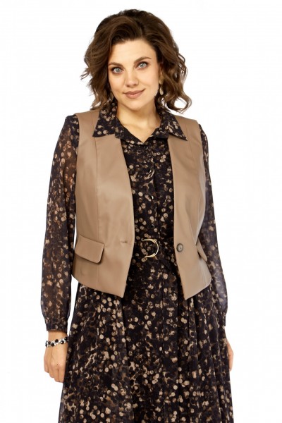 Комплект женский, состоящий из платья и жилета. Платье свободного силуэта, шифоновое, полностью на подкладке. Рукав втачной, снизу собран на манжету, манжета застегивается на петлю и пуговицу. По талии платье отрезное, спереди до талии планка на петли и пуговицы и нагрудные вытачки, которые позволяют создать идеальную посадку по груди. Юбка-шестиклинка. Дополнительно в комплекте к платью присутствует пояс из основной ткани. Жилет полуприлегающего силуэта из эко-кожи, с накладными декоративными клапанами, застежка на одну петлю и пуговицу.