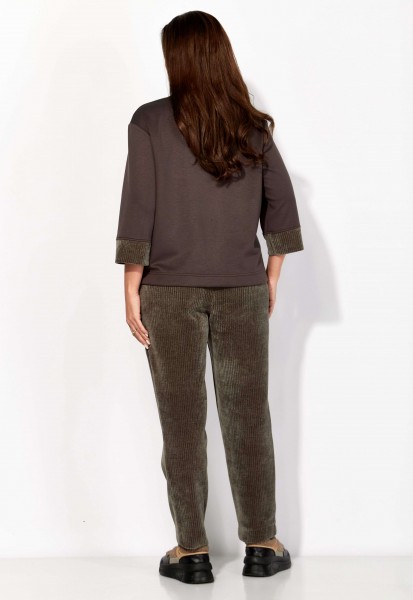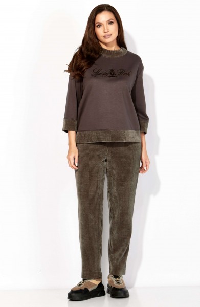 Комплект женский, 2х предметный, состоящий из джемпера и брюк, в сочетании двух видов трикотажного полотна. Джемпер прямого силуэта, с рукавом длинной 3/4. Рукав со спущенной линией плеча. По низу отрезная манжета. Горловина круглой формы, с широкой подрезной бейкой. По низу переда отрезная планка. Перед задекорирован принтом. Манжеты рукавов, бейка горловины и планка низа из отделочного трикотажного полотна. Спинка без особенностей. Брюки прямые. По переду наклонные карманы. Пояс притачной с резинкой и кулисой.