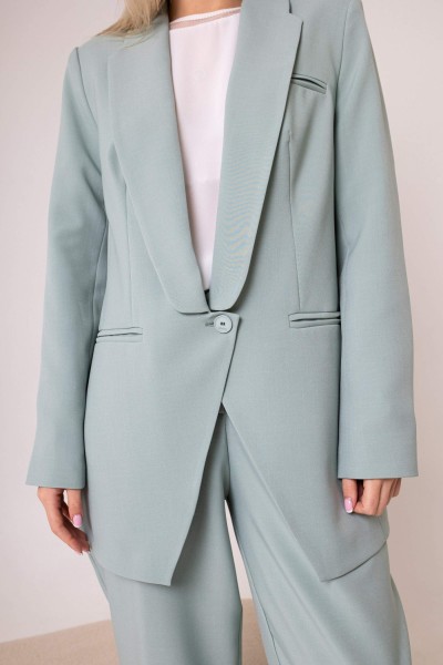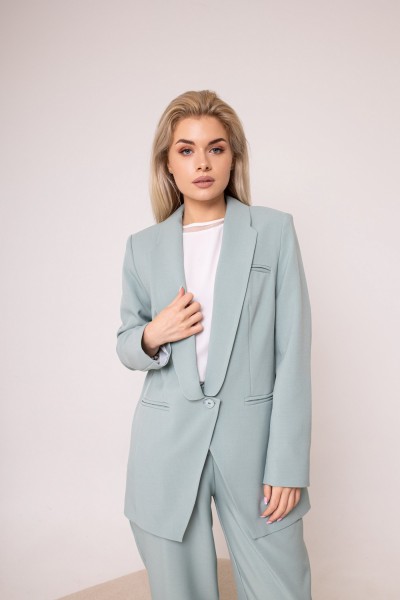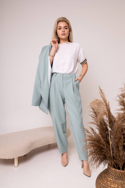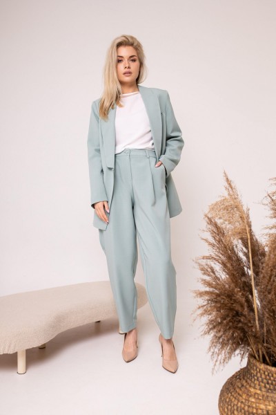 Жакет для стильных женщин, полуприлегающего силуэта из костюмной ткани. Перед с центральной застежкой на одну петлю-пуговицу. По переду боковые функциональные карманы. С левой стороны карман – «обманка». Спинка со средним швом, переходящим в шлицу. Рукава втачные двухшовные. Воротник цельнокроенный, шалевый. Жакет на подкладке. Модные женские брюки – «бананы» свободного кроя, зауженные к низу из костюмной ткани. На переднем полотнище вертикальная складка. На заднем – вытачки. В боковых швах расположены карманы. Брюки с застежкой спереди на молнию и одну петлю-пуговицу.