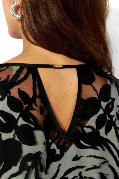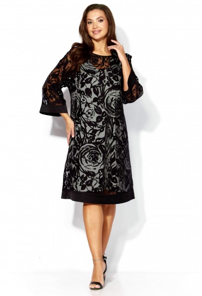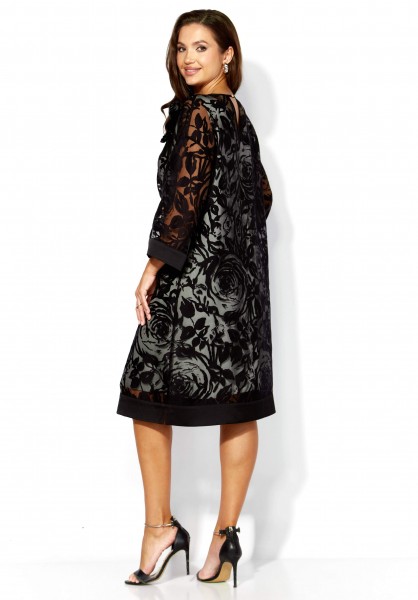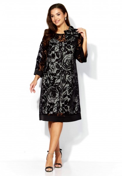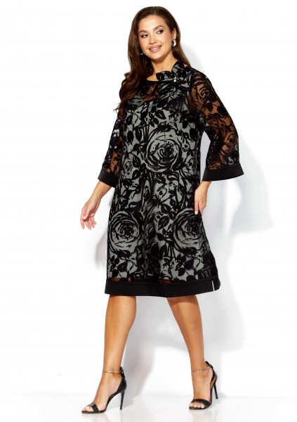 Комплект женский, 2х предметный, состоит из верхнего и нижнего платья. Верхнее платье выполнено из ткани органза. Платье А-силуэта с рукавом длинной 3/4. Рукав со спущенной линией плеча. По низу рукава и платья отделочные планки из атласа. Вырез горловины по переду "лодочка", по спинке фигурный акцентирован атласной бейкой. По спинке декоративная нашивка. Декором служит съемный цветок. Нижнее платье из вискозного атласа А-силуэта с выточками нагрудными, без рукавов. Вырез горловины по переду У-образной формы, закругленный, по спинке острый. По спинке средний шов.