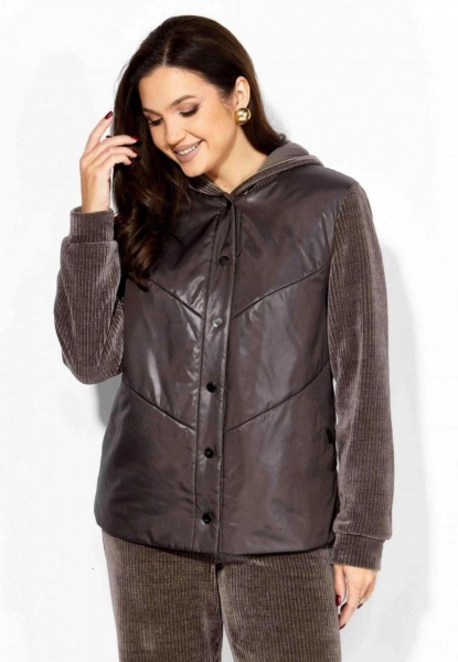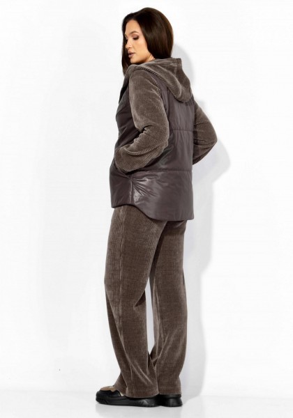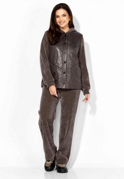 Комплект женский, 2х предметный, состоящий из куртки и брюк, выполнен из двух видов ткани-плащевка на синтепоне и вельвет на трикотажной основе. Куртка прямого силуэта. По переду наклонные рельефы и функциональные карманы. Застежка центральная, с отрезной планкой на кнопки. Рукав длинный, втачной с манжетой по кругу. Горловина оформлена манжетой по низу. Горловина оформлена капюшоном. Спинка с широкой стежкой, чуть удлиненная по низу. Перед спинки на подкладке.