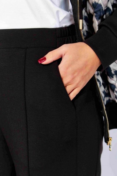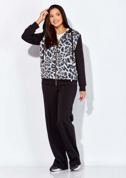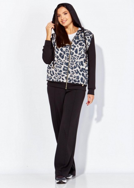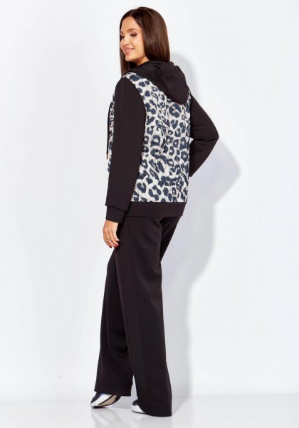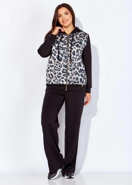 Комплект женский, 2х предметный, состоящий из куртки и брюк, из стежки и трикотажного полотна. Куртка прямого силуэта, по низу на манжете. Перед и спинка выполнены из стеганной на синтепоне, с подкладкой, принтованной текстильной ткани. Карманы в боковых швах. Рукав втачной, длинный, по низу на манжете. Горловина оформлена капюшоном с кулисой. Застежка центральная на тесьму "молния". Брюки широкие, прямые. По боку подрезной лампас с отделочной строчкой и карманы. По центру переда прострочены защипы ("стрелка"). Капюшон, рукава, манжет низа куртки и брюки из трикотажного полотна.