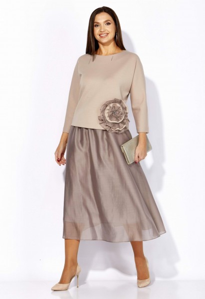 Комплект женский, 2х предметный, состоящий из блузки и юбки. Блузка полуприлегающего силуэта с цельнокройным рукавом длинной 3/4. Выполнена из трикотажного полотна "ТЕНСЕЛ". Вырез горловины "лодочка" По низу блузки, слева, декоративный элемент из рюши, в сочетании двух видов ткани. По спинке средний шов. Юбка широкая к низу, из текстильной ткани "вуалька" На подкладке. Пояс притачной с резинкой по кругу.