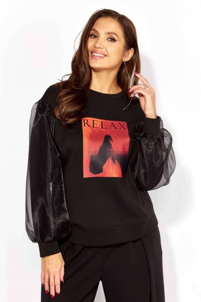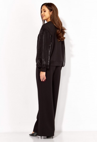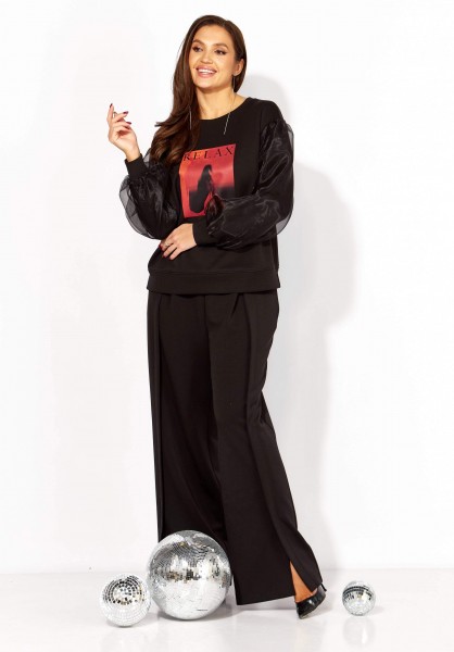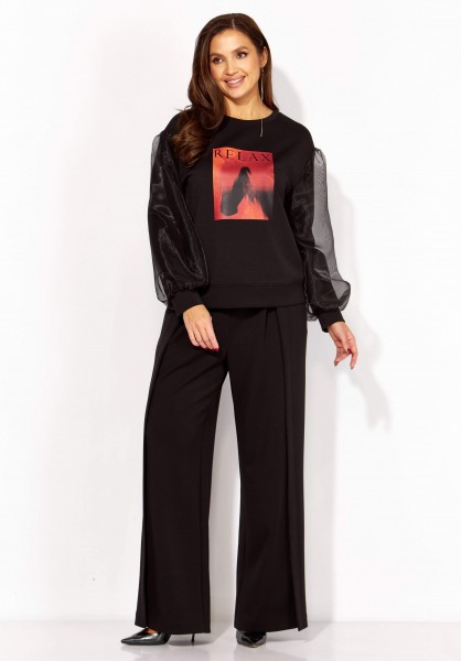 Комплект женский, 2х предметный, состоящий из джемпера и брюк, выполнен из трикотажного полотна"TENSEL" с отделкой органзой. Джемпер прямого силуэта с длинным рукавом. Рукав со спущенной линией плеча, двойной. Нижний-трикотажное полотно, верхний- объемный, со сборкой по окату и низу, из органзы. По низу манжета. Вырез горловины круглой формы с подрезной бейкой. По низу притачная планка с разрезами по бокам. Перед задекорирован ярким принтом. Брюки прямые, широкие. По переду отлетные наклонные складки, по низу с разрезами. От пояса мягкая складка. Карманы в боковых швах. Пояс притачной, с резинкой по кругу.