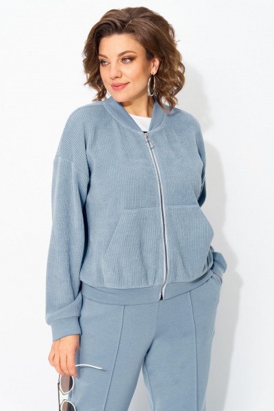 Этот костюм отлично садится на большие размеры и плюс сайз, подчеркивая достоинства фигуры и скрывая лишнее. Длина бомбера – по спинке 65 см, рукав – 62 см.
