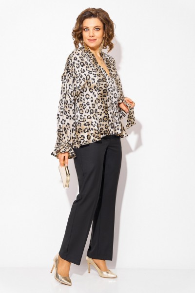 Леопардовая нарядная блузка в стиле «Оверсайз» – это модный предмет гардероба, который ассоциируется с уверенностью и энергией. Модель свободного силуэта трапеция, с ассиметричной линией низа. Линия горловины v-образная, переходит в мягкую стойку-бант. Рукав длинный на резинке, на спущенном плечевом поясе. Низ изделия и низ рукава оформлен мягким воланом. Спинка с небольшим v-образным вырезом. Брюки в комплекте прямого фасона, средней посадки. Пояс притачной, в боковых участках вставлена резинка. Застежка – брючная тесьма-молния с обработанным гульфиком. По переду заутюжены канты.