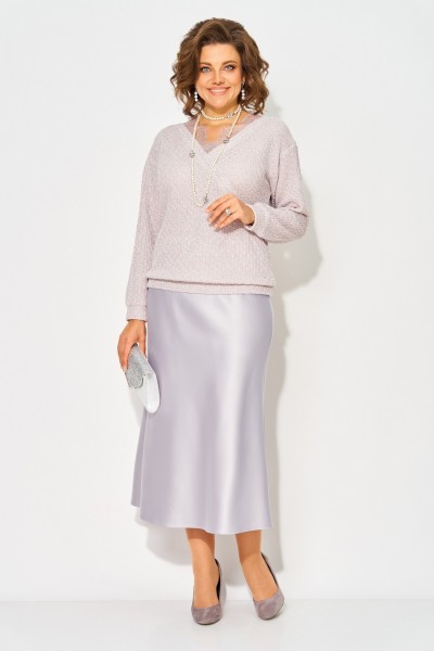 Эффектный праздничный комплект, состоящий из вязанного джемпера с ажуром и сатиновой юбки в жемчужно-лиловой расцветке. Мягкий и нежный материал этого джемпера делает его очень приятным на ощупь, теплым и уютным, а легкое мерцание придает свою изюминку. Горловина v-образной формы приковывает взгляды к линии декольте. Рукав длинный, на спущенной линии плеча. Низ рукава, а также низ изделия оформлен мягкой трикотажной манжетой.