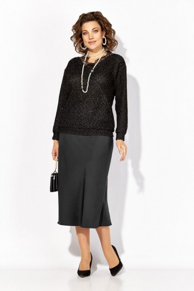 Эффектный праздничный комплект, состоящий из вязанного джемпера с ажуром и сатиновой юбки в жемчужно-лиловой расцветке. Мягкий и нежный материал этого джемпера делает его очень приятным на ощупь, теплым и уютным, а легкое мерцание придает свою изюминку. Горловина v-образной формы приковывает взгляды к линии декольте. Рукав длинный, на спущенной линии плеча. Низ рукава, а также низ изделия оформлен мягкой трикотажной манжетой.