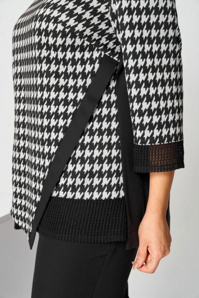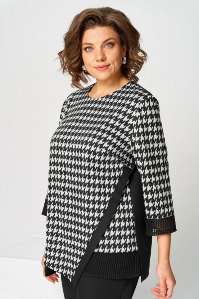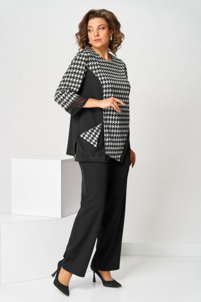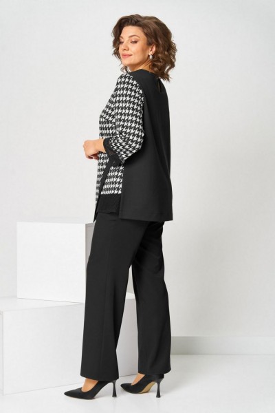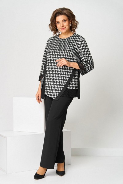 Костюм брючный (двойка) женский полуприлегающего силуэта, состоит из джемпера и брюк. Костюм выполнен и трикотажного полотна и брючной ткани. Джемпер выполнен из трикотажа. На передней половине джемпера карман, водящий в рельеф. К левому боковому шву наискосок расположена декоративная планка По низу рукавов, карманов вставки из ткани "сетка". Брюки классические, на поясе с резинкой. Застежка на гульфик, на тесьму-молнию. Вверху косые карманы. Длина изделия джемпер - 69 (±1) см., брюки - 100 (±2) см. Рисунок абстракция, гусиная лапка Длина рукава 47 (±1) см.