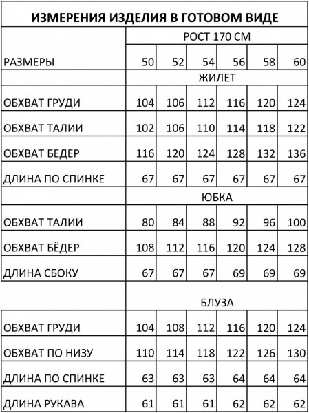 Женский костюм состоит из жилета, юбки и блузы. Двубортный жилет полуприлегающего силуэта на подкладке длины до середины бедра с фигурной горловиной V-образной формы и функциональными прорезными карманами по переду застегивается на петли и пуговицы. Юбка классическая "карандаш" на подкладке с завышенной линией талии на поясе-обтачке застегивается на тесьму-молнию и имеет сзади шлицу. Юбка и жилет выполнены из высококачественной ткани с содержанием вискозы 70%. Блуза женская свободного силуэта выполнена из легкого непросвечивающегося сатина, которая имеет втачные рукава с манжетами на пуговицах и вырез горловины округлой формы. Костюм полностью соответсвует заявленному размеру.