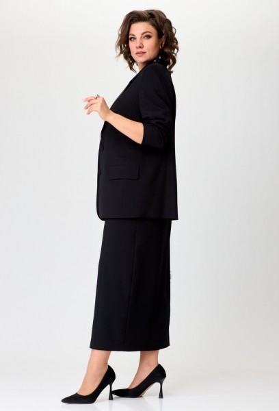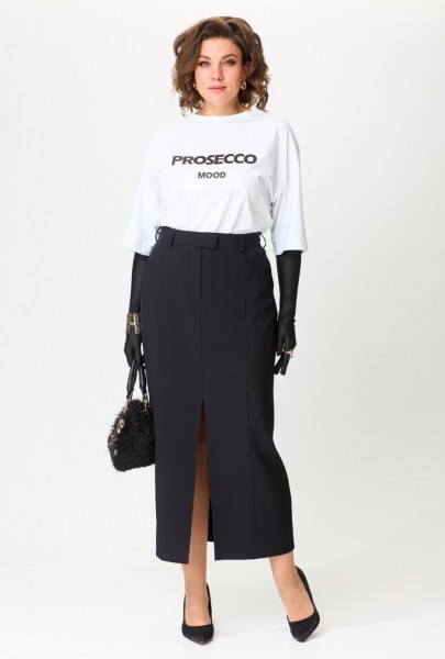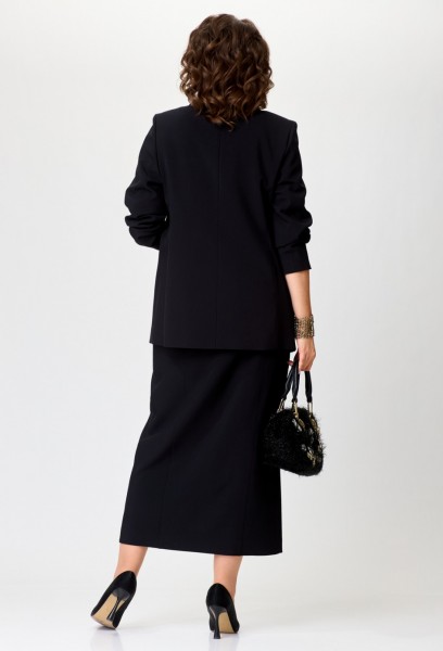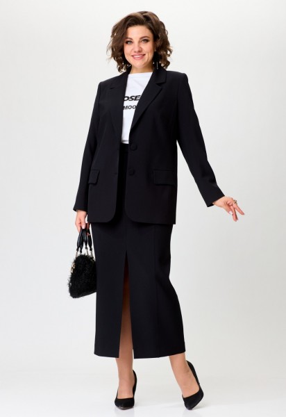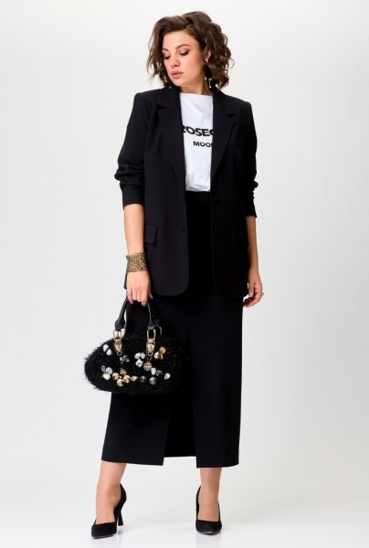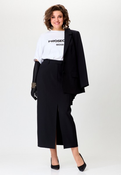 Элегантный комплект-тройка, состоящий из жакета, футболки и юбки. Жакет прямого силуэта с намеком на полуприлегание, с застежкой на две петли и две пуговицы. Перед жакета с рельефами, нагрудными вытачками и прорезными карманами с клапаном. Спинка жакета со средним швом. Длина жакета - до середины бедра. Рукава двухшовные втачные. Горловина оформлена воротником пиджачного типа. Белая футболка прямого силуэта имеет универсальный крой, со спущенной линией плеча и втачным рукавом. Горловина обработана трикотажной бейкой из основной ткани. В центральной части переда расположен контрастный современный принт высокого качества. Юбка классической формы, длиной maxi, cлегка заужена к низу. Верхний срез обработан притачным поясом с резинкой, идущей от бокового шва и по задним половинкам. Перед состоит из 4 частей, рельефы отстрочены декоративной строчкой. По низу центрального рельефа - разрез. В верхней части переда обработаны фигурные карманы. Застежка по переду — на тесьму молнию, потайную пуговицу и крючок.