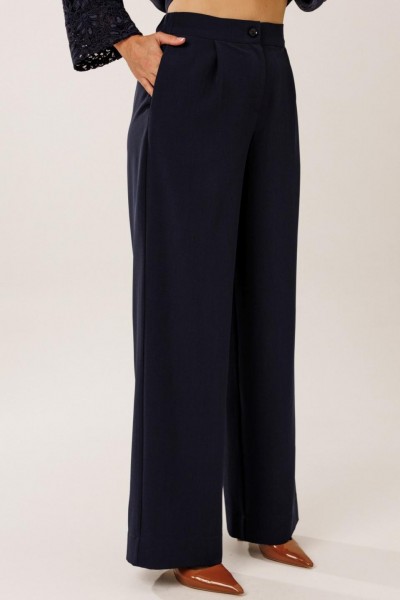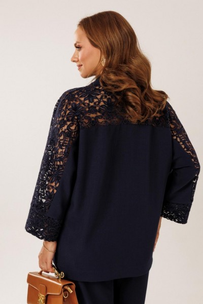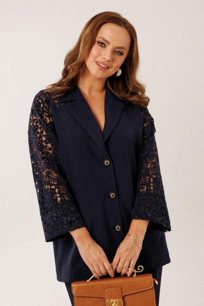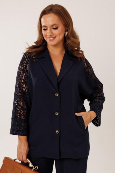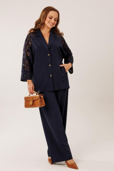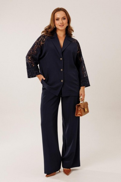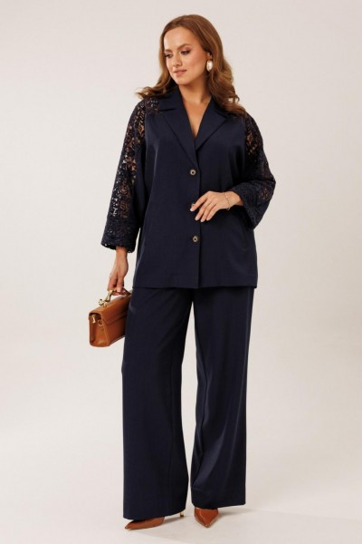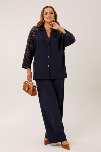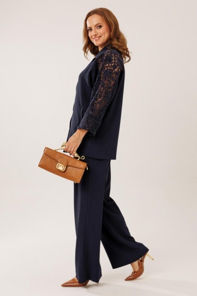 Костюм состоит из жакета с брюками. Жакет однобортный без подкладки, прямого силуэта с цельнокроеными рукавами. На полочках жакета обработаны наклонные прирезные карманы «в рамку» с листочкой. Кокетка полочки переходящая в кокетку спинки и верхнюю часть рукава из набивного гипюра в цвет основной ткани жакета. Манжета рукава так же из набивного гипюра. Спинка жакета прямая. Застежка на декоративные петли пуговицы. Горловина обработана втачным воротником с отрезной стойкой и лацканами. Брюки прямого силуэта от бедра с карманами в боковом шве. На передних половинках брюк заложены по 1 складке. По спинке брюк обработаны вытачки. Подгибка низа широкая. Застежка брюк на «молнию» в гульфике. Пояс брюк отрезной с частичной резинкой по спинке брюк.Цвет материала может отличаться по тону в зависимости от настроек вашего монитора!
