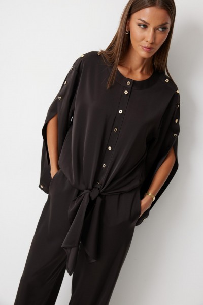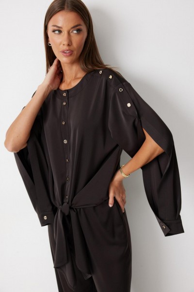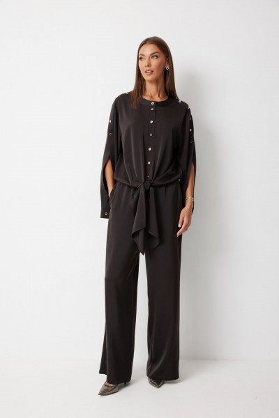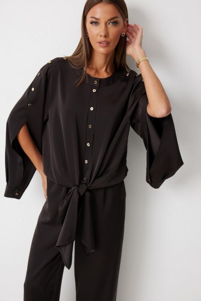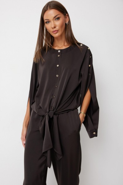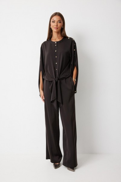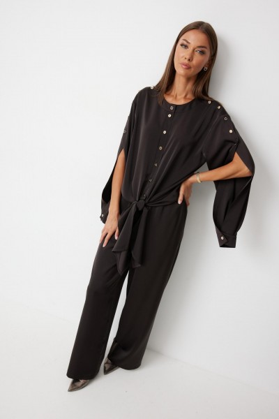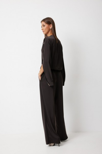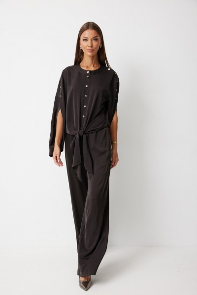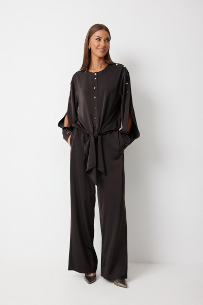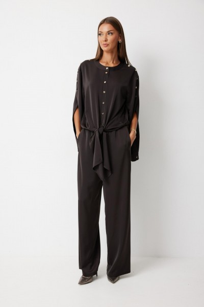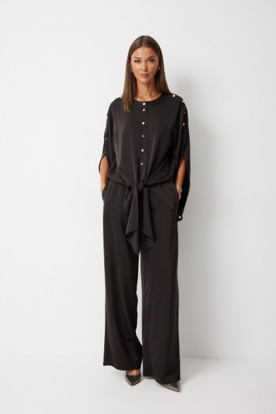 Костюм женский состоящий из блузки и брюк. Блузка прямого силуэта с втачными фантазийными рукавами и разноуровневой линией низа. Блузка по переду предполагает завязку полочек и застегивается на петли пуговицы. Спинка блузки обработана резинкой по нижнему срезу. Горловина блузки обработана отрезной стойкой. Рукав с плечевым швом застегивается на декоративные пуговицы. По низу рукава расположена складка, рукав обработан притачной манжетой застегивающейся на петлю и пуговицу. Брюки прямого силуэта полной длинны В боковых швах брюк обработаны карманы. Верх брюк обработан отрезным поясом «на резинке». Цвет материала может отличаться по тону в зависимости от настроек вашего монитора.