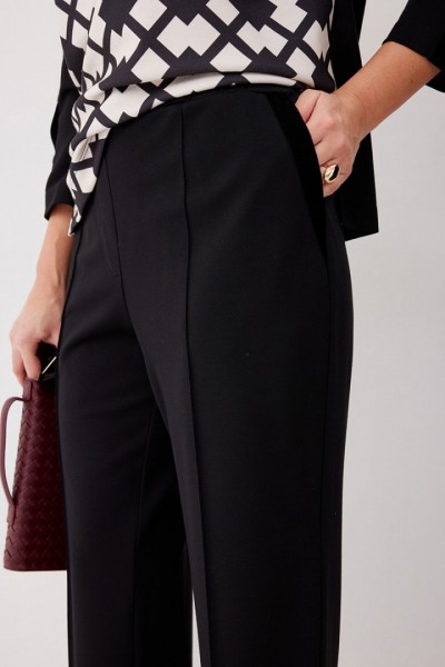 Костюм состоящий из блузы с брюками. Блуза по типу «поло» из трикотажной ткани длиной до середины бедра с застежкой до линии груди. Втачные планки обработаны декоративной тесьмой и застегиваются на кнопки. Перед выполнен из ткани с принтом. По левой половинке выполнен карман обманка с листочкой с декоративной тесьмой и кнопкой. Спинка прямая. Горловина обработана втачным воротником. Рукав ¾ прямой одношовный. На рукавах настрочена декоративная бархатная лента, на правом рукаве с тремя полукольцами. Брюки прямого силуэта из трикотажной ткани с поясом на частичной резинке. По передним половинкам брюк застрочены стрелки и выполнены наклонные карманы с отрезным бочком. Верх кармана декорирован бархатной тесьмой. По передним половинкам отстрочен гульфик (имитация). По спинке брюк застрочены вытачки.